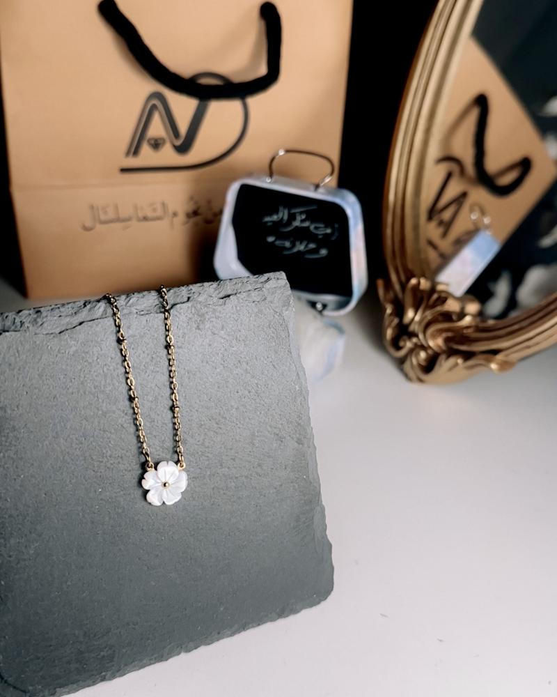 السلسلة الذهبية الرفيعة تضفي توازناً مثالياً مع الزهرة، مما يجعلها قطعة فريدة تناسب جميع الإطلالات.